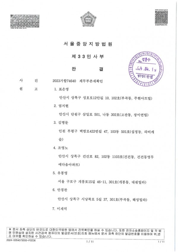 - 정본판결문중앙 23가합74640 채무부존재확인, 화성신남-표은영외43명, 2024041419.pdf (3.0M) 32회 다운로드 | DATE : 2024-04-19 14:57:11